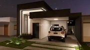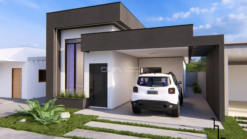 A casa conta com 3 quartos, sendo 1 suíte, além de uma sala ampla para dois ambientes integrada à cozinha, trazendo mais luminosidade e fluidez aos espaços. O pé-direito alto valoriza ainda mais o projeto, proporcionando sensação de amplitude e elegância.